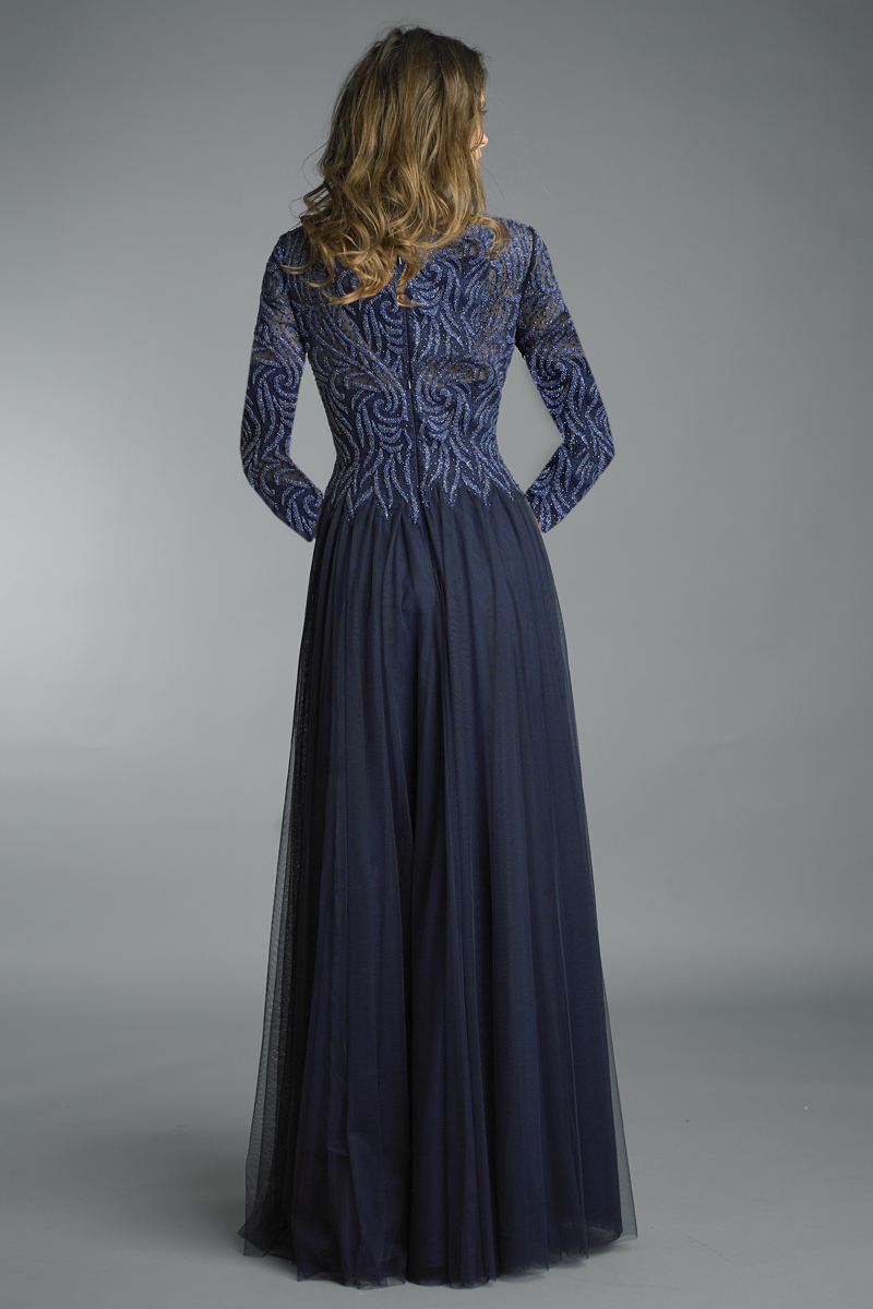 long sleeve evening gown with sequin beaded motif