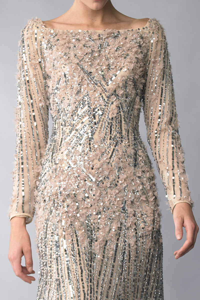 Long sleeve evening gown with a motif of laser cut flowers and sequins by basix black label