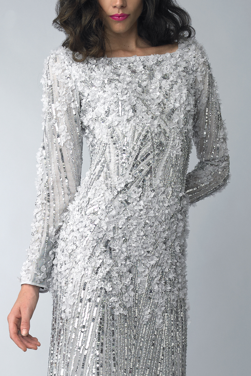 Long sleeve evening gown with a motif of laser cut flowers and sequins by basix black label