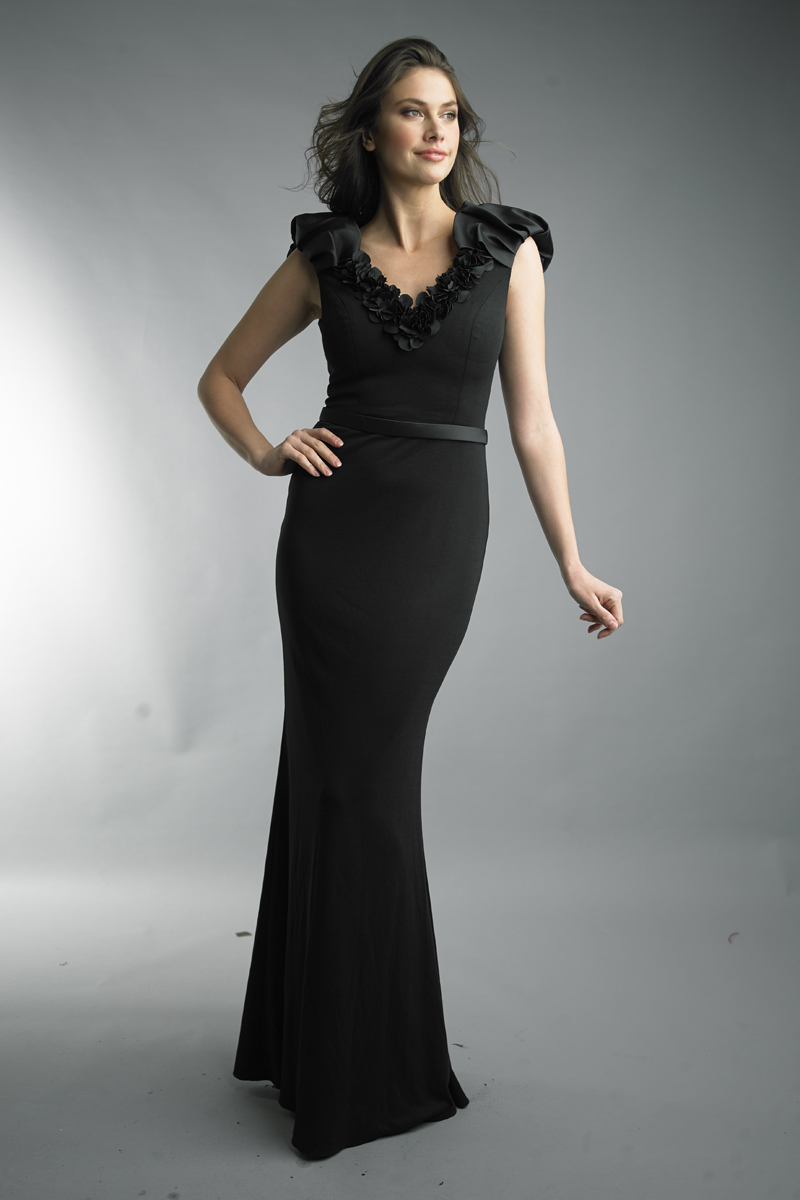 v neck belted gown with puff collar
